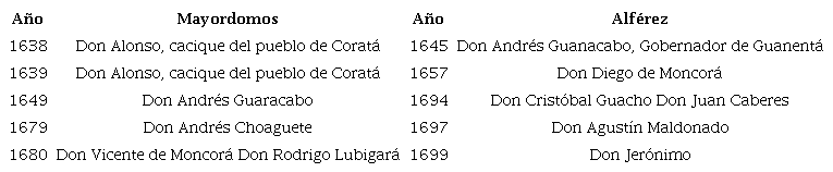 En el libro de cofradía se evidencia un desplazamiento de caciques y capitanes del cargo de mayordomía al de alférez, pues al mismo tiempo que el cargo de mayordomo se concentraba en una sola persona, el de alférez empezó a ser detentado de manera grupal por caciques e indígenas del común, hombres y mujeres procedentes de diferentes parcialidades del pueblo de Moncorá. Esto coincide con la observación de Marta Herrera-Ángel sobre las autoridades indígenas en el siglo XVIII, cuando afirma que "en la documentación colonial por lo menos durante las primeras seis décadas se percibe una clara identificación entre los capitanes y sus respectivas partes o parcialidades, al interior de los pueblos de indios. Sin embargo, en el transcurso del siglo, su identificación se fue desdibujando"75.