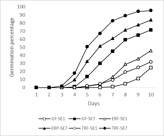 Variance analysis were performed for germination each day and over all the days, and also for number of days to germination; considering the main factors and their interaction. Variables resulting in statistical differences were subjected to Tukey mean test. All the statistical analyses were performed with Statistix for Windows v. 8.0.