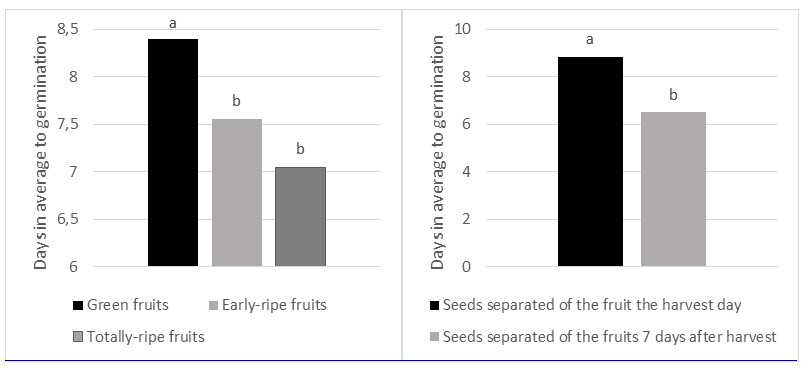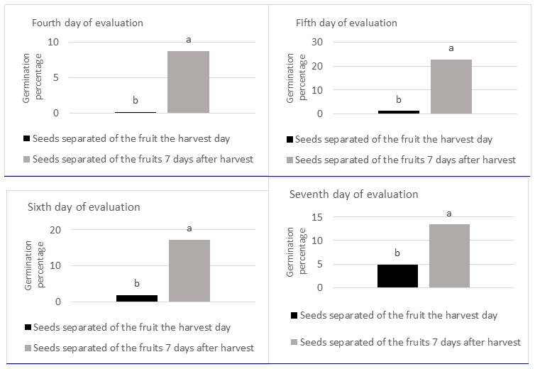 Evaluation of seed germination in six combinations between three fruit maturation stages and two moments of seed extraction from the fruits resulted in data showed in Figure 1. Germination started at day 3 for seeds coming from totally-ripe fruits and separated at day 7 Interaction for Maturation of the Fruit and Separation Moment of the Seed did not show significant differences (P>0,05) neither for Germination Percentage (for each day or over all the days) nor for Number of Days to Germination. Germination percentage for fourth, fifth, sixth, and seventh day of evaluation showed differences (P<0,01) only for Moment of Seed Separation: germination for seeds separated of the fruit at day 7 was in average 10-fold higher (P<0,01) than germination percentage of seeds separated of the fruits at day 1 (Figure 2). Germination percentage accumulated on the ten days of evaluation displayed statistical differences (P<0,01) for both main factors (Figure 3); totally- and early-ripe fruits had germination over 60% while green fruits did not reach 50%. Seeds separated 7 days after fruits harvest had more than 80% of germination, while seeds separated the same day of the fruits harvest reached only 34% of germination. Number of days to germination resulted also with differences (P<0,01) for the main factors evaluated (Figure 4). While seeds obtained from green fruit germinated in 8,40±1,49 days, seeds obtained from early-ripe fruits germinated in 7,56±1,48 days, and from totally-ripe fruits in 7,05±1,66 days. More evident for number of days to germination is the effect of moment of seed separation of the fruits: 6,50±1,28 days for seeds separated from the fruits at day 7 after harvest, and 8,75±0,94 for seeds separated from the fruit the same day of the harvest.