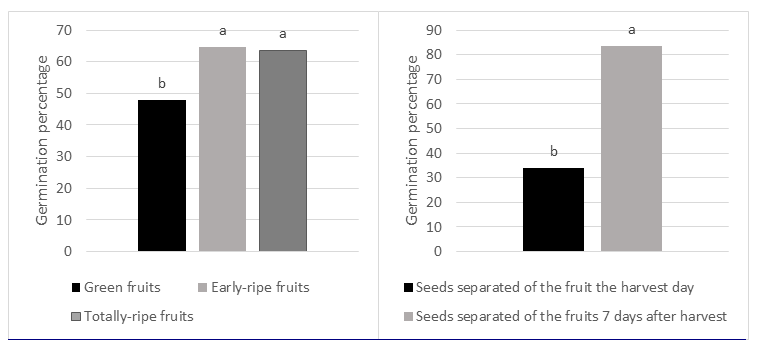 of 71-81 days after anthesis was found in pepper (Capsicum baccatum) seeds [17]; this result differs as compared to results of present work, where maximum germination occurred with early-ripe fruits, and this fruit state occurred about day 55 after anthesis.