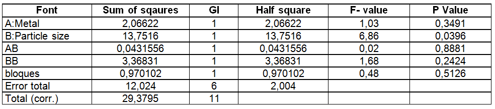 The results obtained from the analysis of variance (ANOVA), carried out to establish the statistical significance of the effect of the metal and the particle size, comparing its mean square with an estimate of the experimental error can be shown in Table 3. Thus, the values of the significant parameters in the process of adsorption of Cr (VI) and Hg (II) over water voids were obtained, and a 95% confidence level was established.
