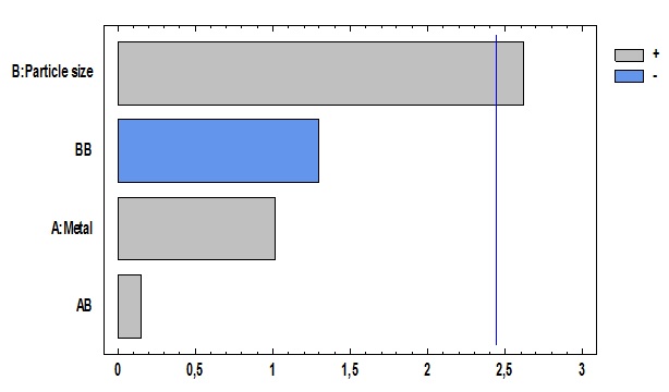 Independently of the metal evaluated, the particle size of the adsorbent is the variable with the greatest positive influence on the process (Figure 1), establishing a standard error of 1,42. On the other hand, since the P-value is more significant than 5,0%, there is no indication of serial autocorrelation in the residues with a significance level of 5,0% [34, 35].