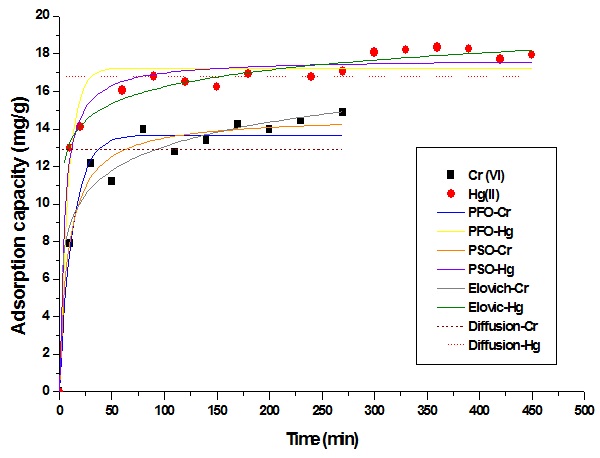 The data obtained from the adsorption tests were fitted to the Pseudo-First Order (PFO) [6], Pseudo-Second Order (PSO) [9] and Elovich [11] kinetic models. Figure 1 shows the fit to the above mentioned Cr (VI) and Hg (II) waterbottle models.