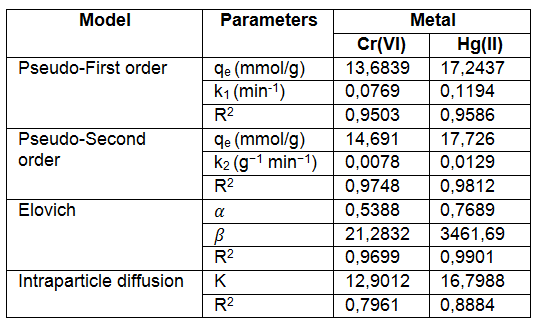 The Elovich model presents a good fit of the adsorption data of both metals, so it can be said that the process also takes place inside the particle pores of bioadsorbent materials and that their active sites are heterogeneous. Thus, exhibiting different activation energies throughout the adsorption process [36]. Furthermore, this suggests that the rate- limiting passage of this adsorption system can be controlled by chemisorption involving valence forces through the sharing or exchange of electrons between sorbent and sorbate [23, 31, 34].