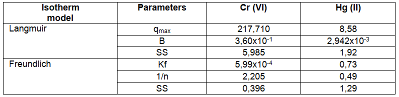 The isotherm that best describes the experimental behavior related to the type of adsorption is the Freundlich model (Figures 3 and 4). This model was chosen according to the highest R2 found using the OriginPro®, which allows to affirm that the adsorption of Cr (VI) and Hg (II) in the water hyacinth occurs in a microporous surface, where unlike the model of Langmuir does not assume the formation of a monolayer, but is applied in multiple layers of adsorption.