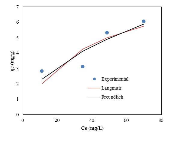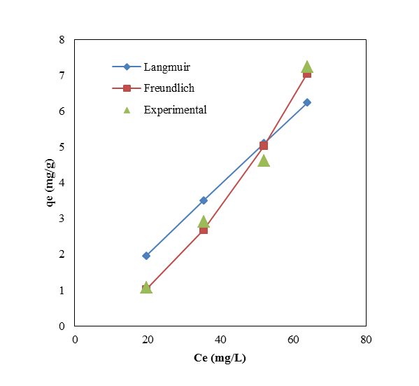 For this reason, it is said that there is an energetically heterogeneous distribution of the available active sites for the adsorption of the metal [39-42]. On the other hand, the value of Freundlich's constant n is in the range 1-10 for Hg (II). This indicates that the adsorption process is favorable [11], [12]