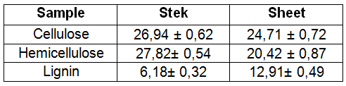 The bioadsorbent material was characterized in order to identify the content of cellulose, hemicellulose by the TAPPI method T 203 os-74, which is a method for the determination of α-, β-, and g-cellulose. For this, the pulp is extracted consecutively with 17,5 and 9,45% sodium hydroxide solutions at 25°C. The soluble fraction, consisting of beta and gamma-celluloses, is determined volumetrically by oxidation with potassium dichromate, and alpha-cellulose, as an insoluble fraction, is obtained by difference. In general, alpha-cellulose indicates a cellulose content of non-degraded molecular weight in the pulp; beta-cellulose indicates that a degraded cellulose, and gamma-cellulose is composed mainly of hemicellulose.
