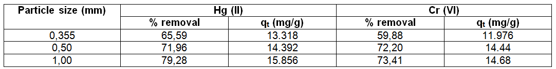 The particle size selection was carried out. The best particle size was 1 mm since was obtained the highest percentage of removal and adsorption capacity of both metals (Table 2). Therefore it was chosen to perform all the tests. The selection was based on choosing that particle size where there would be a lower absorbance, indicating the lower concentration of the metal in the solution after being in contact with the biomass; this, in turn, indicates a higher percentage of removal [7, 27, 28].