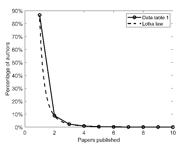 Figure 1 shows the percentage of authors who have published between 1 and 10 articles. The continuous line graph is obtained from the data of this study, and the dotted in-line plot is a square minimum adjustment to the Lotka Law [45], see Equation 1.