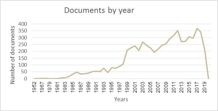 The overall dynamic of production in this field of knowledge is shown in Figure 3. Growth is evident after 1999 and it presents two peaks; one in 2012 with 352 articles and another in 2017 with 366. In 2006, a sharp decline was observed, but then a remarkable recovery was seen until 2012.