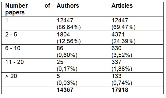 Authors Records. Of the 14367 authors found, 86,64% registered a single biotechnology publication in the agricultural and industrial sector, the 12,56% between 2 and 5, the 0,60% between 6, the 10, 0,17% between 11 and 20, and the 0,03% more than 20 (see table 1).