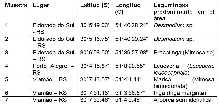 Este estudio se realizó en el Laboratorio de Microbiología de Suelos y en el invernadero del Departamento de Suelos de la Universidad Federal do Rio Grande do Sul (UFRGS). Se tomaron muestras de suelo en diferentes lugares de las zonas rurales del estado de Rio Grande do Sul, Brasil (Cuadro 1). El muestreo se realizó a juicio a una profundidad de 0 a 20 cm, considerándose la presencia de plantas leguminosas nativas o introducidas. Adicionalmente, fueron recolectados nódulos de plantas de Desmodium sp en la Estación Experimental Agronómica (EEA) de la UFRGS en el municipio Eldorado do Sul.