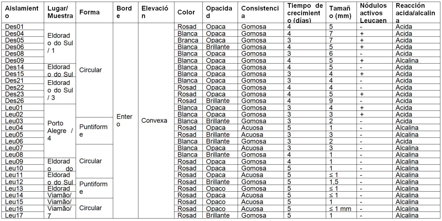 Todos los aislamientos bacterianos fueron transferidos a otras cajas de Petri con medio LMR con el propósito de obtener colonias con morfología persistente. Se realizó una evaluación diaria del crecimiento bacteriano de cada placa y con la ayuda de un microscopio estereoscópico, se determinó la morfología colonial, observándose el diámetro y color de la colonia, tipo de borde, opacidad, consistencia y tiempo de crecimiento [15]. Además, se evaluó el cambio de pH en el medio de cultivo de levadura manitol con adición de azul de bromotimol (LMA+AB). Los aislamientos puros se mantuvieron en tubos de ensayo de medio LMA en refrigeración a 4°C.