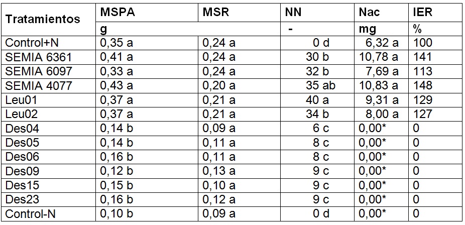 Cuadro 3. Valores promedio de masa seca de la parte aérea (MSPA), masa seca de la raíz (MSR), número de nódulos (NN), nitrógeno acumulado (Nac) de las plantas inoculadas con rizobios y el índice de eficiencia relativa (IER).