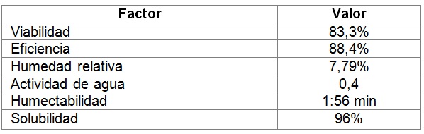 La humectabilidad tiene un menor tiempo, en comparación al estudio de Montes [21]; este autor menciona que la lenta rehidratación tiene un efecto positivo sobre la viabilidad de las cepas microencapsuladas, lo que sugeriría que se necesita mejorar su contextura con otros materiales microencapsulantes.