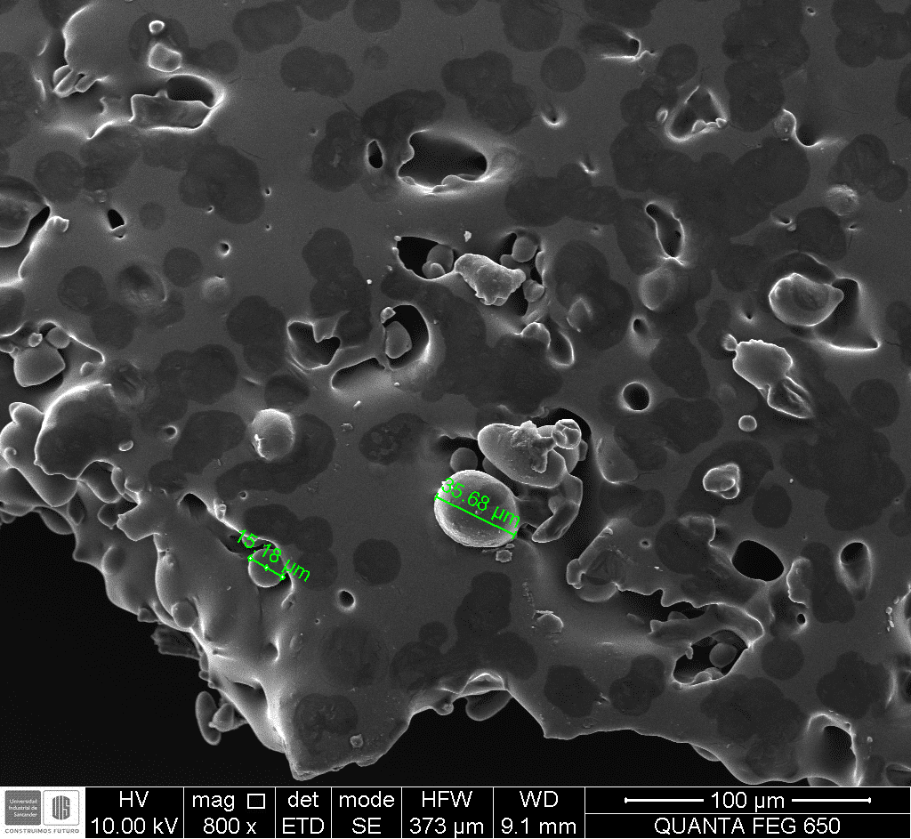 El tamaño y la morfología se observan en las figuras 1. En cuanto al tamaño de partícula se encontraron valores de 15,18 a 35,68 µm. Los estudios muestran que el tamaño del microencapsulado influye sobre la viabilidad de la bacteria [27]. Ramos et al. [27] manifiesta que tamaños entre los 2 y 100 µm se consideran adecuados para una microencapsulación, ya que si son demasiados grandes dificulta la liberación de la cepa y si son muy pequeños, su protección no será efectiva. Por ello, los resultados encontrados tienen un efecto positivo sobre la microencapsulacion de L. plantarum.