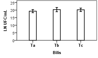 En todas las variables se determinó estadística descriptiva. El crecimiento a diferentes concentraciones de sales biliares y bilis se evaluó mediante un diseño completamente al azar (DCA) con tres tratamientos: Ta 0,3% de sales biliares, Tb 0,5% de sales biliares y Tc crecimiento sin sales biliares (testigo), cada tratamiento contó con 8 réplicas. Para la variable bilis, se usó el mismo diseño y número de réplicas por tratamiento (Ta: bilis al 0,3%, Tb con bilis al 0,5% y Tc sin bilis).
