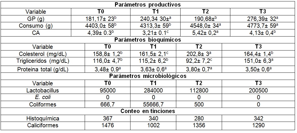 Cuadro 2. Parámetros productivos, bioquímicos, microbiológicos, e histológicos.
