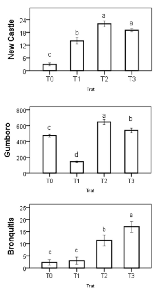 Los resultados para títulos se observan en las figuras 3. Se encontró una mayor seroconversión para los tratamientos con administración de L. plantarum (T2 y T3), lLo que demuestra un efecto positivo de la bacteria. En el caso de Gumboro y bronquitis muestran resultados similares, ya que T2 y T3 presentan los mayores valores de seroconversión.