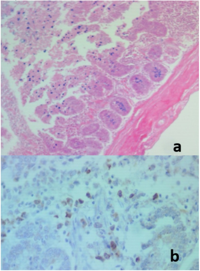 Para histoquímica se emplearon marcadores monoclonales inmunohistoquímicos de uso en humanos CD3 y CD79a a los bloques de parafina del tracto gastrointestinal de los animales para evaluar la expresión de linfocitos T y B del tejido linfoide asociado al intestino GALT.