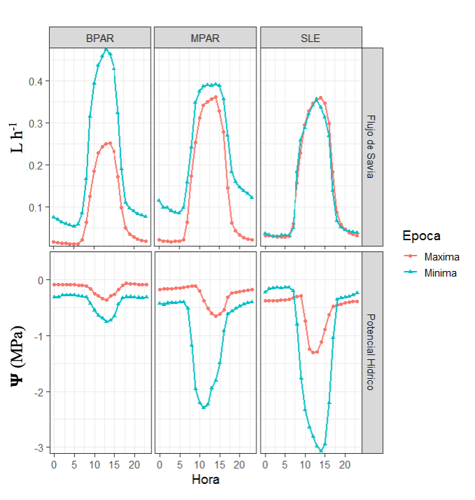 El potencial hídrico es el trabajo necesario para llevar el agua ligada al nivel del potencial de agua pura (MPa = 0) a una misma temperatura y presión atmosférica [25]. Esta variable influye en el crecimiento celular, la fotosíntesis y la productividad de los cultivos, y es un indicador del estado hídrico del cultivo [26]. El monitoreo del flujo de savia (V.) y del potencial hídrico del xilema (Ѱ MPa) en las especies arbóreas permite estimar la transpiración [27] y entender las respuestas específicas de la planta a la variación de los parámetros ambientales, la disponibilidad de agua y luz [28, 29], para proponer el desarrollo de sistemas de producción estables [30].