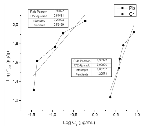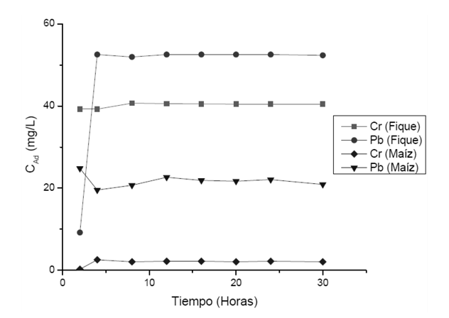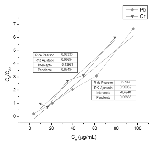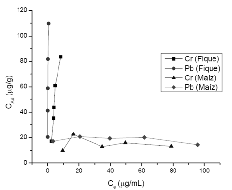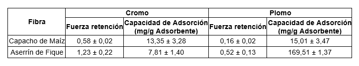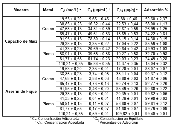 Los resultados de los procesos de adsorción de las dos fibras vegetales se determinaron en un rango de concentración de 19,53 ± 0,20 y 91,95 ± 0,13 mg/L para Cr y de 20,38 ± 0,13 y 110,21 ± 0,35 mg/L para Pb. En el cuadro 1 se observa que, para ambos metales, a bajas concentraciones se presenta la mayor capacidad de adsorción en la fibra de capacho de maíz; por otro lado, se evidencia que el residuo lignocelulósico del fique presenta los mejores porcentajes de adsorción (con un valor mínimo de 88 % para Cr y de 99 % para Pb) en el rango de concentraciones evaluado.