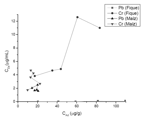La máxima capacidad de desorción (CDe) de los metales Cr y Pb adsorbidos en las muestras vegetales se logró con una solución 0,5M (pH 1,49) de ácido cítrico (Figura 5), observando que en la fibra de fique hay menor desorción de Pb que Cr, mientras que en la fibra de maíz se observa un comportamiento similar de desorción para ambos metales, evidenciando que la fibra de fique presenta mejor retención de los metales al compararlo con la fibra de maíz, especialmente para Pb.