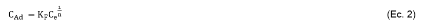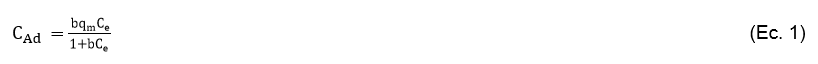 Se determinó la máxima capacidad de adsorción de Cr y Pb en las muestras de material vegetal, tomando como referencia las metodologías estudiadas por Vishan et al. (2019) y el “Standard Methods” (APHA, 2018), donde 1,0 g de cada fibra vegetal se puso en contacto con 25 mL de cada metal en concentraciones de 20, 40, 50, 70 y 100 mg/L de cromo y plomo a 170 rpm por el tiempo de equilibrio predeterminado, posteriormente, las muestras fueron filtradas y se cuantificó la concentración remanente de los metales en la solución por EAA-IL. La cantidad estimada de cada metal adsorbido se estableció por la diferencia entre la concentración de metal suministrado y la concentración del metal que permanece en la solución una vez alcanzado el equilibrio, con los datos obtenidos se realizó un gráfico de la concentración adsorbida versus la concentración en equilibrio en la solución, para valorar la forma de la isoterma de biosorción y comparar con las gráficas de adsorción propuestas por Sing et al., (1985) y comparar su forma para determinar el tipo de curva y deducir por semejanza el comportamiento del proceso de biosorción y de esta manera linealizarlas mediante el uso de las ecuaciones de isotermas de Langmuir (Ecuación 1) y Freundlich (Ecuación 2) (Beni and Esmaeili, 2020), donde CAd representa la concentración adsorbida y C. la concentración en equilibrio en ambas ecuaciones, con las cuales se calculá la capacidad máxima de adsorción en