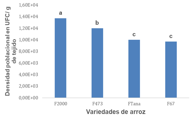 Se aislaron 107 morfotipos de bacterias endófitas de cuatro variedades de arroz identificadas como Fedearroz 2000 (F2000), Fedearroz Tana (FTana), Fedearroz 437 (F437) y Fedearroz 67 (F67). El análisis de varianza entre densidad poblacional de bacterias endófitas por variedad y tipo de tejido mostró diferencias significativas (p<0,05), mientras que la prueba múltiple de rango Tukey para las poblaciones de bacterias endófitas mostró significancia en cuanto a cantidad de estas bacterias por variedades de arroz analizada. Las variedades con mayores densidades se presentaron para la variedad F2000 (1,37x104 UFC/g de tejido) seguida de F473 (1,2x104 UFC/ g de tejido); la menor densidad de bacterias fue para la variedad FTana y F67, las cuales presentaron densidades de (1,0x104 y 9,7x103 UFC/g de tejido), respectivamente (figura 1).