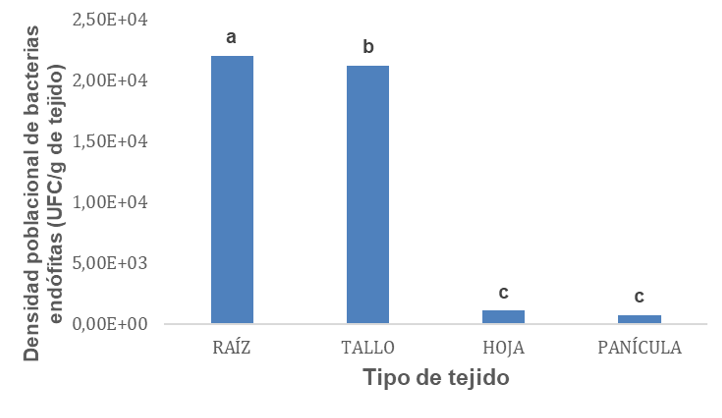 La prueba múltiple de rango Tukey para la densidad de bacterias endófitas en función a tipo de tejido mostró una mayor colonización en raíces 2,2x104 UFC/g de tejido y tallo con 2,12x104 UFC/g de tejido; mientras la menor cantidad de bacterias endófitas fueron aisladas en hojas y panículas con valores de 1,1x103 y 7,2x102 UFC/g de tejido, respectivamente (figura 2).