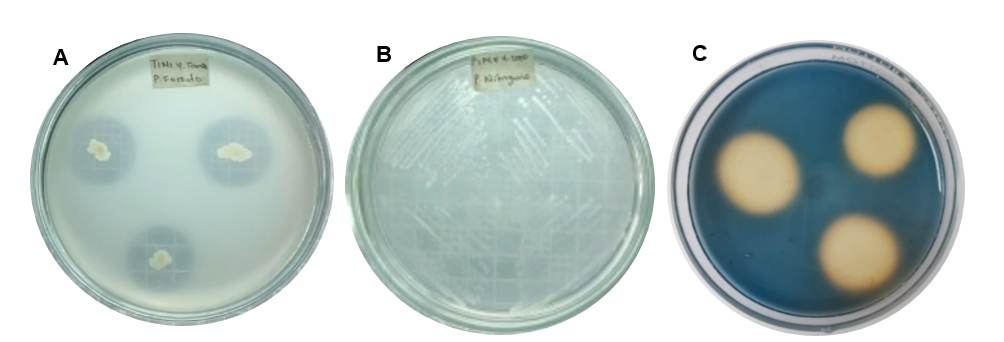 Solubilización de fosfato. La determinación de solubilización de fosfato fue mediante la inoculación de colonias en el medio de cultivo sólido NBRID incubado durante 7 días a 30°C. La aparición de halos claros alrededor de las colonias es considerada como indicador positivo para la solubilización fosfato (Walitang et al., 2017).