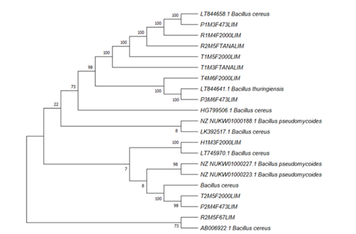 El análisis filogenético del gen 16S ARNr para bacterias endófitas con actividad de promotora de crecimiento vegetal (figura 4), muestra que 11 especies de bacterias mostraron alta similitud con secuencias almacenadas en banco de datos de GenBank, corresponde a las especies de Bacillus thuringiensis y B. cereus pertenecientes a la clase Firmicutes. En este análisis, los morfotipos T4M6F2000LIM, P3M6F473LIM, aislado de tallo de la variedad Fedearroz 2000 y de panícula de la variedad Fedearroz 473, fue identificado como B. thuringiensis, mostrando in vitro capacidad de solubilizar fosfatos y producción de sideróforos. Los aislados correspondiente a P1M3F473LIM, R1M4F2000LIM, R5M5FTANALIM, T2M5F2000LIM, P2M4F473LIM, T1M5F2000LIM, T1M3FTANALIM, H1M3F2000LIM y R2M5F67LIM obtenidos de panícula, hoja, raíz y tallo, de la variedad Fedearroz 2000, F473, F67 y FTana fueron identificados como B. cereus, mostrando actividad de fijación de nitrógeno, solubilización de fosfatos y producción de sideróforos.