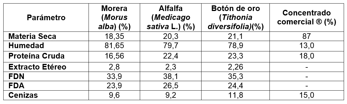 La composición proximal de Morera (Morus alba), Botón de oro (Tithonia diversifolia), Alfalfa (Medicago sativa L.) y el concentrado balanceado comercial se informa en el Cuadro 1.
