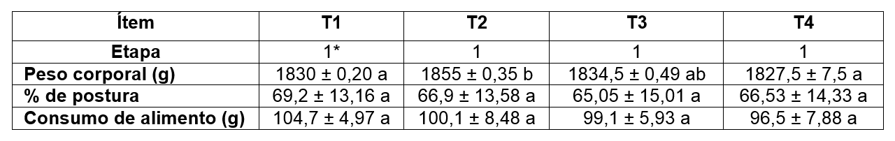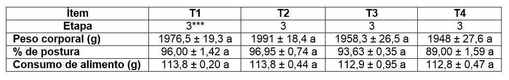 En el intervalo 2 y 3 no se evidenciaron diferencias estadísticamente significativas (p<0,05), entre tratamientos, sin embargo, el peso promedio y el porcentaje de postura del T2 mostraron valores levemente superiores en relación a los demás tratamientos (Cuadro 3 y 4).