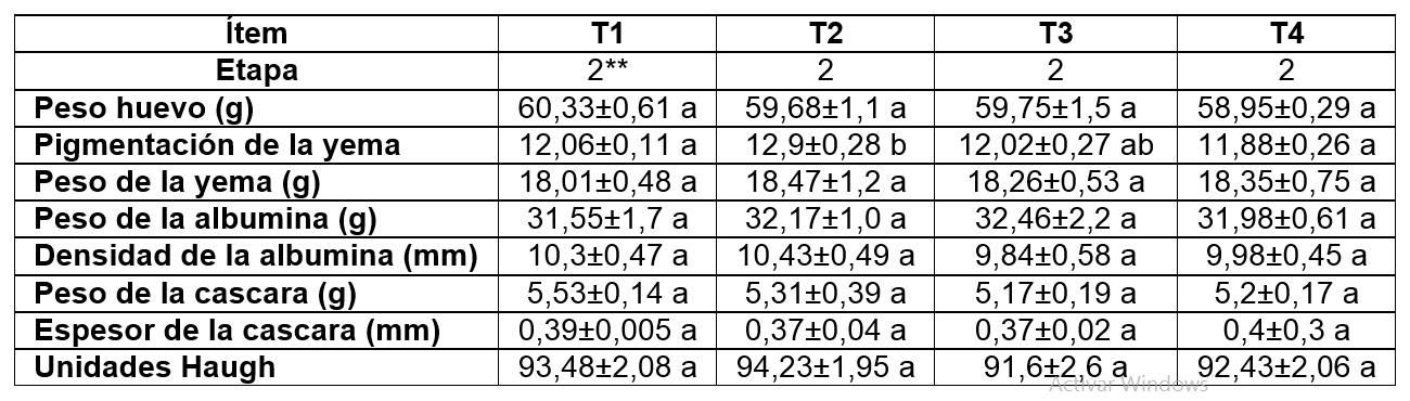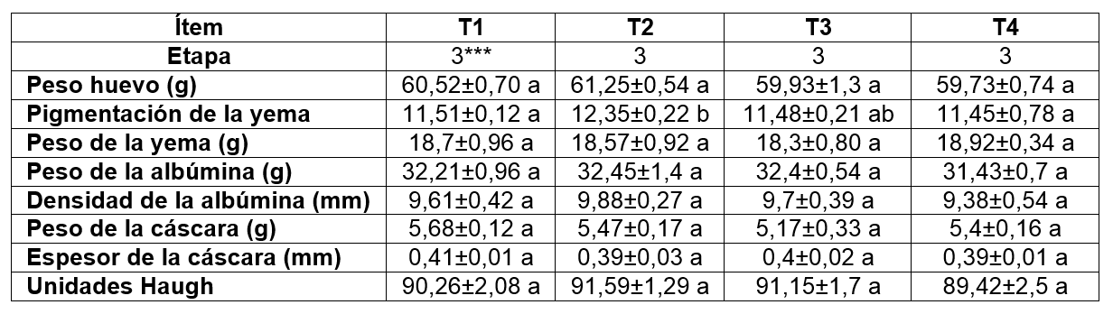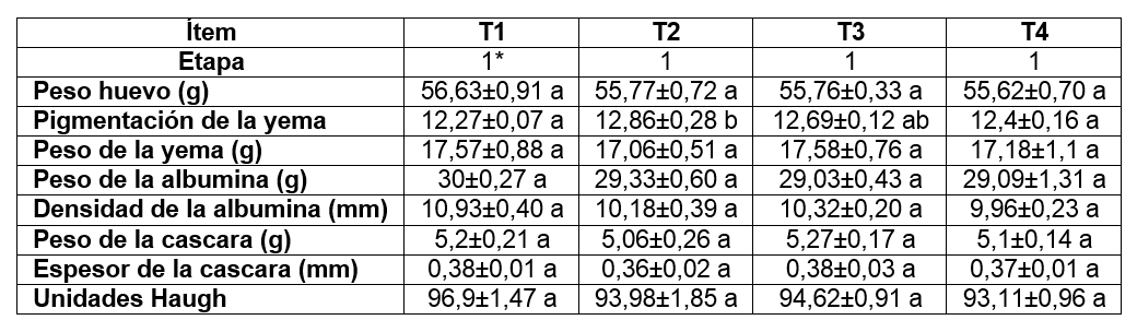 En el intervalo 1 se observaron diferencias estadísticamente significativas (p<0,05) en la pigmentación de la yema, siendo T2 el que muestra valores superiores. En relación con el peso del huevo, peso de la yema y albumina, peso y espesor de la cáscara, los valores fueron estadísticamente similares (p<0,05) en todos los tratamientos, sin embargo, aunque no se evidenciaron diferencias estadísticamente significativas (p>0,05) en las unidades Haugh, el T1 mostró una leve mejora obteniendo 96,9 % en comparación con los demás tratamientos (Cuadro 5.)