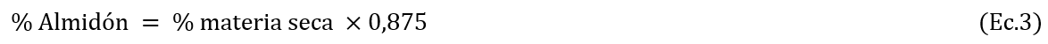 El porcentaje de almidón en raíces frescas de yuca se determinó teniendo en cuenta que éste constituye alrededor del 85-90 % del contenido de materia seca, entonces el contenido de almidón puede ser estimado tomando un promedio de ese rango (0,875) por medio de la ecuación 3, (Aristizábal et al., 2007).