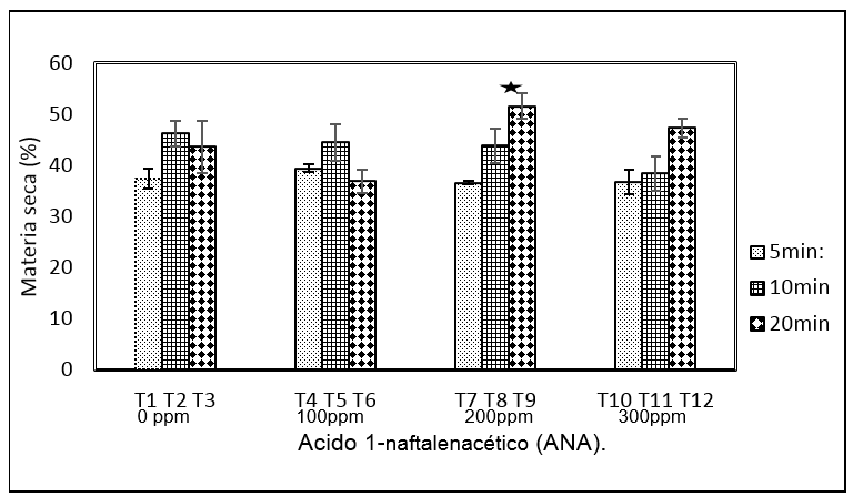 Figura 1: Materia seca de raíz por tratamientos (T): ANA en partes por millón (ppm) con respecto al tiempo de inmersión en minutos. Los valores representan la media ± Desviación estándar. Diferencias significativas p < 0.05.
