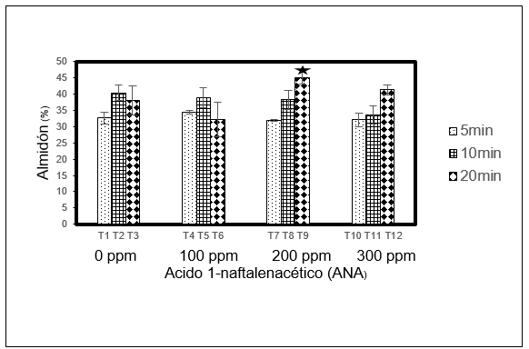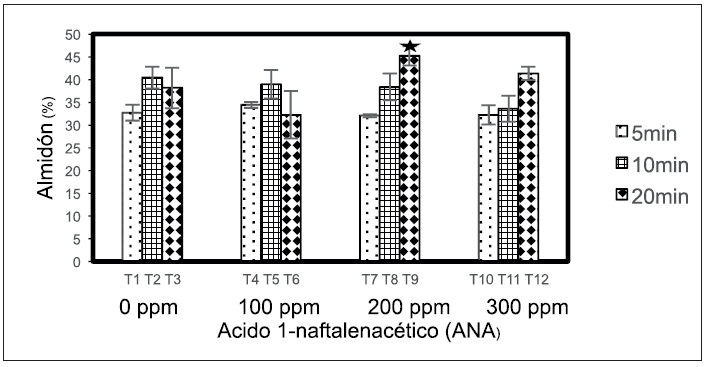 Figura 3: Porcentaje de almidón por tratamientos (T): ANA en partes por millón (ppm) con respecto al tiempo de inmersión en minutos. Valores representan el porcentaje ± Desviación estándar. Diferencias significativas p < 0,5.