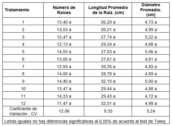 Con respecto a la longitud de la raíz, se observaron tendencias con mayor longitud promedio en los tratamientos T12 (32,51 cm) y T9 (32,15 cm), es decir, los tratamientos con mayor concentración de ANA mostraron una tendencia de mejores resultados para longitud promedio en comparación con los tratamientos de menor concentración (0 y 100 ppm de ANA). Al aplicar la prueba del coeficiente de correlación de Pearson (r= 0,54 y .= 0,05), se observó una correlación lineal directa entre la concentración de ANA y la longitud promedio de las raíces, resultados que difieren de los hallados por Burgos et al. (2009) para el cultivar de yuca palomita.