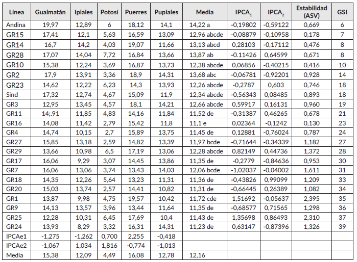 De acuerdo con la gráfica de biplot obtenida, los genotipos con mayor respuesta a los estímulos ambientales fueron: GR25, GR1, GR24, GR17, GR7 y GR18. La proyección ortogonal de los genotipos sobre los vectores de las localidades, indica que la línea GR25 presentó interacción favorable en las condiciones de baja precipitación presentadas en Potosí; GR1 y GR24 en la localidad de Puerres; GR7 en Gualmatán y GR18 en Ipiales (Figura 1, Cuadro 4); estas líneas lograron superar el promedio en la respectiva localidad donde se tuvo la interacción favorable.