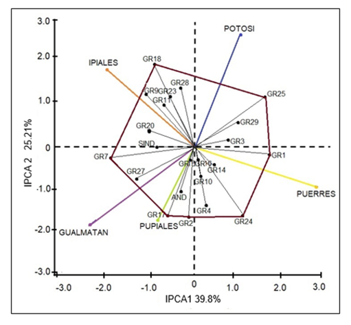 El modelo AMMI mostró que el primer componente principal (IPCA1) explicó el 39,8 % de la variación y el segundo (IPC2) el 25,21 % de la misma, de tal manera que el IPCA1 y el IPCA2 explicaron en conjunto el 65,01 % de la variación presente en la interacción GXA (Cuadro 4). Entre los ambientes probados, la menor contribución a la interacción en el primer componente principal fue la de Gualmatán (IPCAe1= -1,275) y el mayor aporte lo hizo el ambiente de Puerres (IPCAe1= 2,255), mientras que en el segundo componente principal el menor aporte lo hizo Gualmatán (IPCAe2= -1,067) y el mayor la localidad de Potosí (IPCAe2= 1,816) (Cuadro 5).
