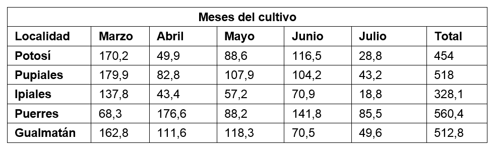Las actividades de campo se llevaron a cabo en cinco municipios del sur del departamento de Nariño, que corresponden a Gualmatán (N00.91001º-W077.56337º), Ipiales (N00.86249º- W077.57143º), Potosí (N00.82494º- W077.56630º), Puerres (N00.86422º- W077.49900º) y Pupiales (N00.86792º- W077.64050º) con alturas de 2961, 2706, 2875, 2616 y 2754 msnm respectivamente. La precipitación registrada durante el cultivo en cada localidad se observa en el cuadro 1, de acuerdo con los datos consolidados y reportados para la época del presente estudio (Instituto de Hidrología, Meteorología y Estudios Ambientales, IDEAM, 2019).