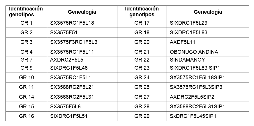 Por otra parte, valores de estabilidad de AMMI (ASV) cercanos a cero indica mayor estabilidad del genotipo a través de las localidades. La línea GR16 mostró la mayor estabilidad (ASV = 0,130), sin embargo, su rendimiento estuvo por debajo de la media general. Nueve genotipos correspondientes a siete líneas con gen afila y los testigos Andina y Sindamanoy alcanzaron rendimientos superiores a la media general y mayor estabilidad al presentar los valores ASV más bajos (entre 0,178 y 0,96) (Cuadro 5). Luego de aplicar el índice de selección GSI, se determinó el siguiente orden de mérito para los nueve genotipos mencionados: Andina, GR15, GR14, GR28, GR10, GR2, GR23, Sindamanoy y GR3 (Cuadro 5).