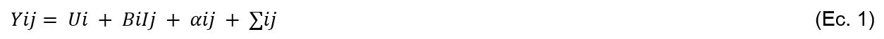 Dónde: Yi = promedio del genotipo i en el ambiente j; Ui = Promedio del genotipo i en todos los ambientes; Bi= Coeficiente de regresión, mide la respuesta del genotipo i al variar los ambientes; Ij= Índice ambiental del ambiente j-ésimo que se calcula como desviación del promedio de los genotipos en un ambiente dado a partir del promedio general; αij = Desviación de la regresión; ∑ij= Error experimental promedio. De acuerdo con este modelo, un genotipo es estable si el coeficiente de regresión es igual a uno ( y predecible cuando las desviaciones de la regresión son iguales a cero.