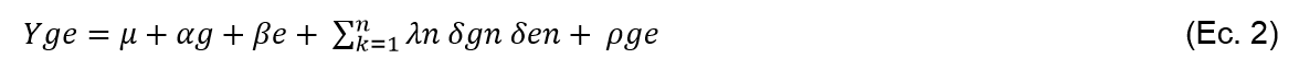 La adaptabilidad y estabilidad se analizó usando el modelo univariado de Eberhart & Russell (1966) (ecuación 1) y el modelo multivariado AMMI (Crossa et al., 1990) (ecuación 2) utilizando el programa GENES (Cruz, 2001).