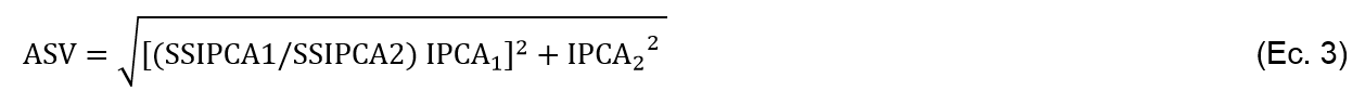 Donde SSIPCA1 y SSIPCA2 son las sumas de cuadrados .el primer y segundo eje del componente principal de la interacción respectivamente; IPCA. e IPCA. es el valor genotípico de cada genotipo en el modelo AMMI; ASV es la distancia desde cero en dos dimensiones en el diagrama de dispersión de los valores de IPCA. frente a las puntuaciones de IPCA..