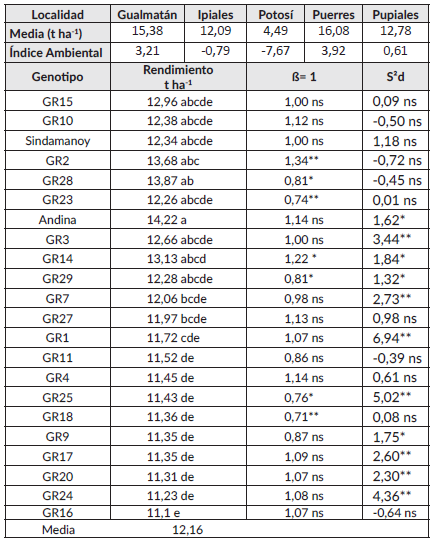 Dentro del mismo grupo de alto rendimiento, la línea GR2 (13,68 t ha-1) presentó un β>1 y S²d=0, que sugiere mejor adaptación a los ambientes favorables como Puerres y Gualmatán con un comportamiento predecible, mientras que GR28 y GR23 (13,87 y 12,26 t ha-1) obtuvieron un β<1 y S²d=0 que indica mejor desempeño en ambientes desfavorables como Potosí y comportamiento predecible. Los genotipos Andina, GR3, GR14 y GR29 a pesar de su alto rendimiento fueron no predecibles, por lo cual limitan sus posibilidades de recomendación para las localidades estudiadas.