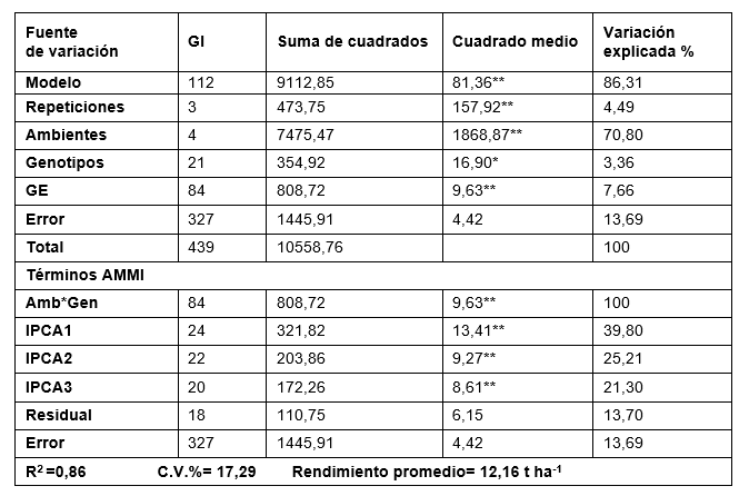 En el análisis de varianza la suma de cuadrados para el efecto ambiental tuvo el más alto efecto sobre el rendimiento obtenido en las líneas evaluadas, representando un 70,80 % de la suma de cuadrados total. La variación entre genotipos explicó un 3,36 % de la variación total y la interacción genotipo ambiente (GE) un 7,66 % (Cuadro 4). La alta proporción en la variación explicada por el ambiente sugiere que existieron ambientes altamente contrastantes, lo cual se relaciona con las variaciones en la oferta ambiental de las cinco localidades en donde se hizo la evaluación, entre ellas las diferencias en la precipitación pluvial.