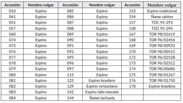 Cuadro 2. Accesiones establecidas de Dioscorea rotundata en el banco de germoplasma de la Universidad de Córdoba durante el año 2015.