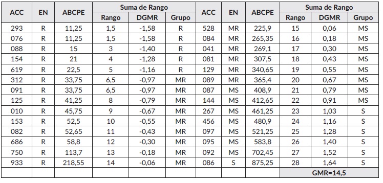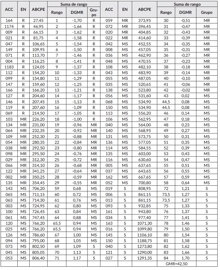 Cuadro 3. Clasificación de la resistencia de las accesiones D. alata a la antracnosis C. gloeosporioides, mediante los métodos de escala de notas (EN) y la suma de rangos.